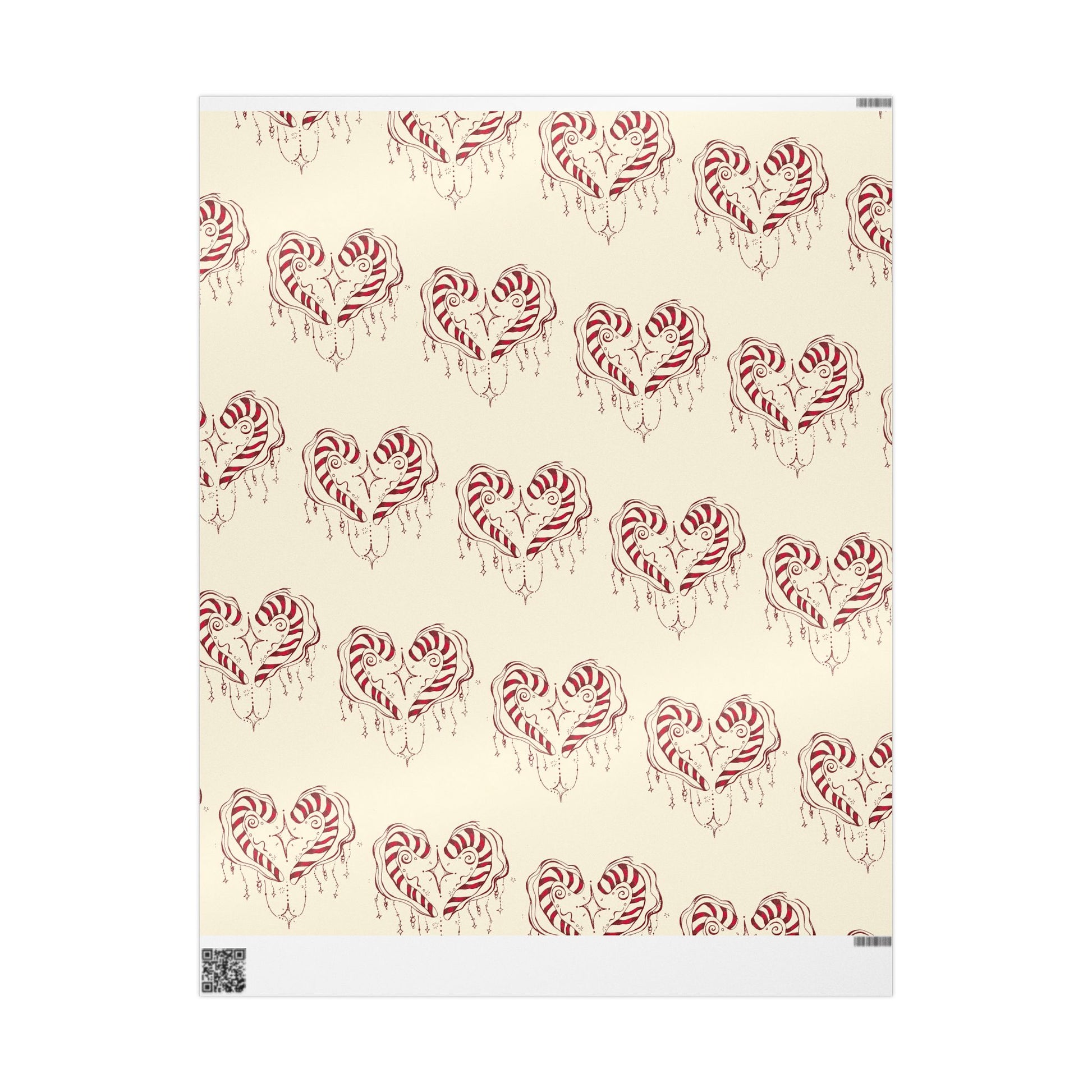 Enjoy this classic wrapping paper creating from hand drawn artwork. Its the perfect detail for speical gifts. Soft cream paper patterned with hand-drawn, candy-cane hearts. The design feels whimsical and like handwritten notes and homemade treats.